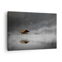 Bild auf Leinwand - Leinwandbild - Ein einsames Häuschen am Wasser, umgeben von Nebel und Vögeln - 70x50cm - Schutz vor Regen - Moderne Wanddekoration für Wohnzimmer und Schlafzimmer ARTTOR