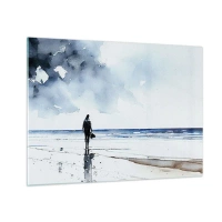Glasbild - Bild auf glas - Silhouette einer Person an der Küste in zartem Aquarell - 70x50cm - Gespräch mit dem Meer - Moderne Wanddekoration für Wohnzimmer und Schlafzimmer ARTTOR