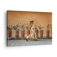 Bild auf Leinwand - Leinwandbild - Eine Frau im Boho-Stil mit Töpfen voller Kakteen im Hintergrund. - 70x50cm - Hippie-Stil - Moderne Wanddekoration für Wohnzimmer und Schlafzimmer ARTTOR