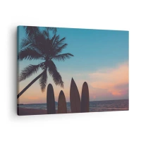 Bild auf Leinwand - Leinwandbild - Surfbretter vor der Kulisse einer Palme und eines Sonnenuntergangs - 70x50cm - Morgen wird es auch lustig - Moderne Wanddekoration für Wohnzimmer und Schlafzimmer ARTTOR