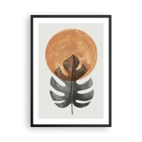 Poster in einem schwarzem Rahmen - Ein Monstera-Blatt vor einem warmen orangefarbenen Kreis - 50x70cm - Immer die Sonne - Moderne Wanddekoration für Wohnzimmer und Schlafzimmer ARTTOR