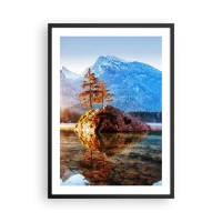 Poster in einem schwarzem Rahmen - Bäume auf einem Felsen spiegeln sich in einem ruhigen See - 50x70cm - Natur in neuem Licht - Moderne Wanddekoration für Wohnzimmer und Schlafzimmer ARTTOR