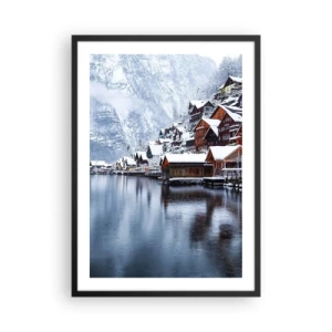Poster in einem schwarzem Rahmen - Winterlandschaft eines Bergdorfes am See - 50x70cm - In winterlicher Dekoration - Moderne Wanddekoration für Wohnzimmer und Schlafzimmer ARTTOR