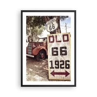 Poster in einem schwarzem Rahmen - Oldtimer am Route 66-Schild - 50x70cm - Die Legende der amerikanischen Provinz - Moderne Wanddekoration für Wohnzimmer und Schlafzimmer ARTTOR
