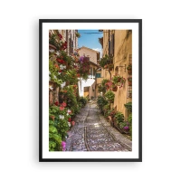 Poster in einem schwarzem Rahmen - Eine bezaubernde Straße mit Blumen und einem Kopfsteinpflasterweg an einem sonnigen Tag - 50x70cm - Italienische Gasse - Moderne Wanddekoration für Wohnzimmer und Schlafzimmer ARTTOR