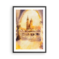 Poster in einem schwarzem Rahmen - Ein Aquarell, das den Krakauer Marktplatz bei Sonnenuntergang zeigt. - 50x70cm - Östlich über dem Krakauer Marktplatz - Moderne Wanddekoration für Wohnzimmer und Schlafzimmer ARTTOR