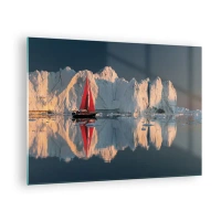 Glasbild - Bild auf glas - Ein Segelboot mit einem roten Segel in der Nähe der Eisberge bei Sonnenuntergang - 70x50cm - Am Rande der Welt - Moderne Wanddekoration für Wohnzimmer und Schlafzimmer ARTTOR