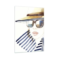 Glasbild - Bild auf glas - Stilvolle Frau mit Hut und Brille im Aquarellstil - 50x70cm - Florida heißt Sie willkommen! - Moderne Wanddekoration für Wohnzimmer und Schlafzimmer ARTTOR
