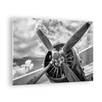 Glasbild - Bild auf glas - Eine Nahaufnahme eines Flugzeugpropellers in Schwarzweiß. - 70x50cm - Eroberer der Lüfte - Moderne Wanddekoration für Wohnzimmer und Schlafzimmer ARTTOR