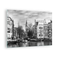 Glasbild - Bild auf glas - Schwarz-Weiß-Ansicht eines Kanals in Amsterdam - 70x50cm - Amsterdamer Atmosphäre - Moderne Wanddekoration für Wohnzimmer und Schlafzimmer ARTTOR