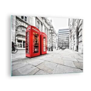 Glasbild - Bild auf glas - Rote Telefonzellen vor dem Hintergrund einer Stadtstraße - 70x50cm - Willkommen in London - Moderne Wanddekoration für Wohnzimmer und Schlafzimmer ARTTOR