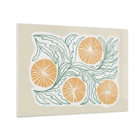 Glasbild - Bild auf glas - Orangefarbene Früchte und grüne Blätter in einer grafischen Komposition - 70x50cm - Ethnisch mit einem Hauch von Abstraktion - Moderne Wanddekoration für Wohnzimmer und Schlafzimmer ARTTOR