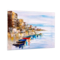 Glasbild - Bild auf glas - Eine Strandpromenade mit bunten Häusern und Wasser - 70x50cm - Mittelmeerstadt - Moderne Wanddekoration für Wohnzimmer und Schlafzimmer ARTTOR