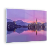 Glasbild - Bild auf glas - Eine Kirche auf einer Insel mit Bergen und einem Sonnenuntergang im Hintergrund - 70x50cm - Eine märchenhafte Insel in der Abenddämmerung - Moderne Wanddekoration für Wohnzimmer und Schlafzimmer ARTTOR