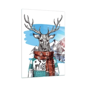 Glasbild - Bild auf glas - Ein Hirsch in Pullover und Schal vor einer Berglandschaft - 50x70cm - Auch ein Reh friert nicht - Moderne Wanddekoration für Wohnzimmer und Schlafzimmer ARTTOR