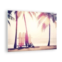 Glasbild - Bild auf glas - Eine Vogelperspektive auf einen tropischen Strand mit Palmen und türkisfarbenem Meer - 70x50cm - Urlaub im Paradies - Moderne Wanddekoration für Wohnzimmer und Schlafzimmer ARTTOR