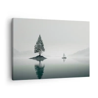 Bild auf Leinwand - Leinwandbild - Eine minimalistische Landschaft mit einem Baum auf einer Insel und einem Segelboot. - 70x50cm - Traum - Moderne Wanddekoration für Wohnzimmer und Schlafzimmer ARTTOR