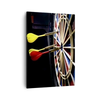 Bild auf Leinwand - Leinwandbild - Eine Dartscheibe mit getroffenen Darts auf schwarzem Hintergrund - 50x70cm - Auf den Punkt gebracht - Moderne Wanddekoration für Wohnzimmer und Schlafzimmer ARTTOR