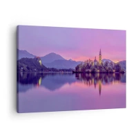 Bild auf Leinwand - Leinwandbild - See mit einer Insel und einer Kirche bei Sonnenuntergang - 70x50cm - Eine märchenhafte Insel in der Abenddämmerung - Moderne Wanddekoration für Wohnzimmer und Schlafzimmer ARTTOR
