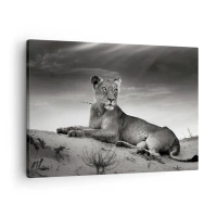Bild auf Leinwand - Leinwandbild - Schwarz-Weiß-Porträt einer Löwin in der Savanne - 70x50cm - Die Königin der Wüstenruhe - Moderne Wanddekoration für Wohnzimmer und Schlafzimmer ARTTOR