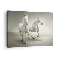 Bild auf Leinwand - Leinwandbild - Zwei weiße Pferde galoppieren vor hellem Hintergrund - 70x50cm - Weiße Macht! - Moderne Wanddekoration für Wohnzimmer und Schlafzimmer ARTTOR