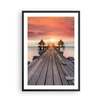 Poster in einem schwarzem Rahmen - Ein Holzsteg mit der untergehenden Sonne über dem Wasser im Hintergrund - 50x70cm - Westen im Osten - Moderne Wanddekoration für Wohnzimmer und Schlafzimmer ARTTOR