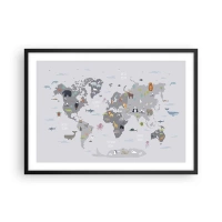 Poster in einem schwarzem Rahmen - Eine Weltkarte mit Tierillustrationen auf grauem Hintergrund - 70x50cm - Sag mir wo du herkommst ... - Moderne Wanddekoration für Wohnzimmer und Schlafzimmer ARTTOR