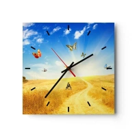 Wanduhr - Glasuhr - Ein goldenes Feld, ein Pfad und Schmetterlinge vor einem blauen Himmel - 30x30cm - Und wie kann man den Sommer nicht lieben? - Moderne Wanddekoration für Wohnzimmer und Schlafzimmer ARTTOR