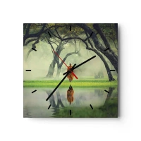 Wanduhr - Glasuhr - Ein Mönch in einer orangefarbenen Robe in einem Wald mit nebligem Hintergrund und Spiegelung im Wasser. - 30x30cm - Auf dem Weg zur Erleuchtung - Moderne Wanddekoration für Wohnzimmer und Schlafzimmer ARTTOR