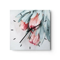 Wanduhr - Glasuhr - Dezente rosa Protea-Blüten auf hellem Hintergrund - 30x30cm - Schämen sich für ihre eigene Schönheit - Moderne Wanddekoration für Wohnzimmer und Schlafzimmer ARTTOR
