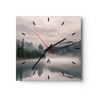 Wanduhr - Glasuhr - Ein nebliger Wald spiegelt sich in einem ruhigen See - 30x30cm - In Reflexion, im Nebel - Moderne Wanddekoration für Wohnzimmer und Schlafzimmer ARTTOR