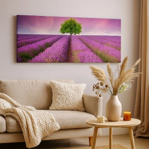 - Das Gemälde zeigt ein malerisches Lavendelfeld mit einem einsamen Baum vor einem violetten Himmel. Die warmen Farben und die friedliche Landschaft bringen Harmonie in naturinspirierte Innenräume.