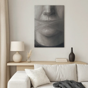 Wandkunst - Kein Wort - Symbolisches Porträt mit verschwommenen Lippen in Grautönen