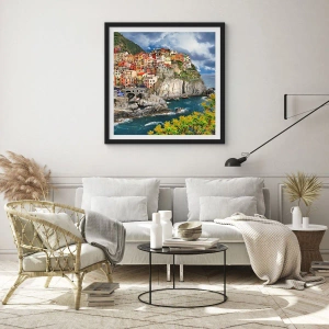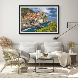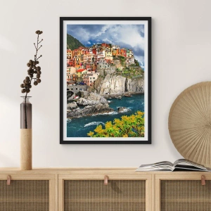 Poster in einem schwarzem Rahmen - Bunte Häuser auf den Felsen am Meer in einer malerischen Stadt - 50x70cm - Eine Gruppe umarmt die Felsen - Moderne Wanddekoration für Wohnzimmer und Schlafzimmer ARTTOR