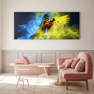 Glasbild - Bild auf glas - Ein bunter Papagei im Flug vor einem gelben und blauen Hintergrund - 50x70cm - Im blauen und goldenen Staub - Moderne Wanddekoration für Wohnzimmer und Schlafzimmer ARTTOR