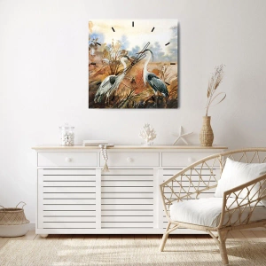Wanduhr - Glasuhr - Zwei Kraniche in einer herbstlichen Aquarelllandschaft - 30x30cm - Wohin im Herbst? - Moderne Wanddekoration für Wohnzimmer, Küche und Schlafzimmer ARTTOR