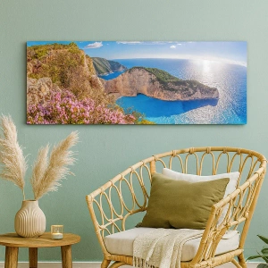 Bild auf Leinwand - Leinwandbild - Eine Klippe mit Blumen, ein türkisfarbenes Meer und eine sonnige griechische Landschaft - 50x70cm - Mein toller Griechenlandurlaub - Moderne Wanddekoration für Wohnzimmer und Schlafzimmer ARTTOR