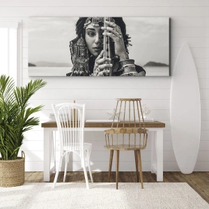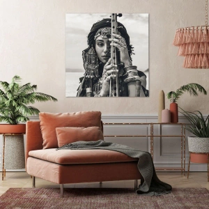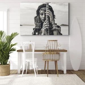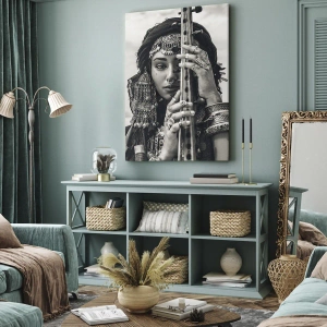 Bild auf Leinwand - Leinwandbild - Porträt einer Frau mit ethnischem Schmuck, die ein Instrument in der Hand hält - 50x70cm - Die Musik des Orients selbst - Moderne Wanddekoration für Wohnzimmer und Schlafzimmer ARTTOR