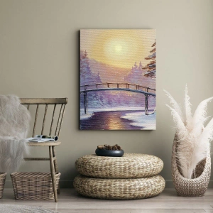 Bild auf Leinwand - Leinwandbild - Winterlandschaft mit einer vom Sonnenuntergang beleuchteten Brücke - 70x50cm - Vier Jahreszeiten - Winter - Moderne Wanddekoration für Wohnzimmer und Schlafzimmer ARTTOR