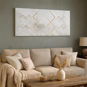 - Ein Leinwanddruck mit minimalistischen goldenen Rauten auf weißem, marmorähnlichem Hintergrund. Ein elegantes Dekorationsaccessoire im modernen Stil, das jedem Interieur Luxus und Harmonie verleiht.