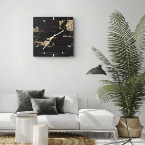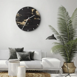 - Die Uhr verfügt über einen schwarzen Hintergrund mit ausdrucksstarken goldenen Farbstrichen, die eine dynamische und dennoch elegante Abstraktion erzeugen. Sie ist ein markantes Element moderner Einrichtung.