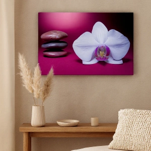 Bild auf Leinwand - Leinwandbild - Weiße Orchidee und Steine auf rosa Hintergrund - 70x50cm - Eine Studie der Frische in Lila - Moderne Wanddekoration für Wohnzimmer und Schlafzimmer ARTTOR