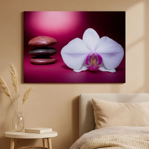 Wandbild – Eine Studie der Frische in Lila – Weiße Orchidee und Steine auf rosa Hintergrund