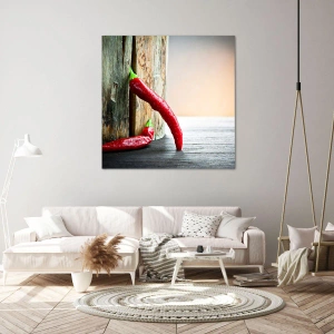 „Rote scharfe Chilischoten“ ist ein Originalgemälde auf Leinwand, das zwei rote Chilischoten auf einem rustikalen Holzhintergrund zeigt. Das intensive Rot der Schoten kontrastiert mit den natürlichen Farbtönen des Holzes und verleiht dem Gemälde einen unverwechselbaren und warmen Charakter. Dieses Motiv passt perfekt in eine Küche oder ein Esszimmer und verleiht dem Interieur Frische und Energie.