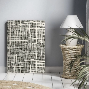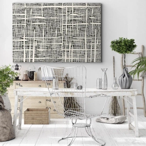 • Das Gemälde zeigt ein geometrisches, gitterartiges Muster vor hellem Hintergrund. Der minimalistische Stil der Komposition verleiht dem Interieur ein modernes und aufgeräumtes Gefühl.
