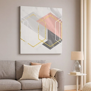 - Ein modernes Gemälde mit geometrischen Formen und goldenen Akzenten auf Marmorgrund. Das minimalistische Design verleiht dem Interieur Eleganz und Harmonie. Eine ideale Wahl für moderne Räume.