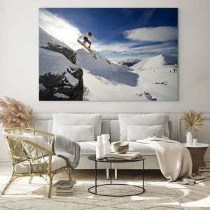 Glasbild - Bild auf glas - Ein Snowboarder springt im Winter von einer Klippe in den Bergen - 50x70cm - Freiheit ohne Grenzen - Moderne Wanddekoration für Wohnzimmer und Schlafzimmer ARTTOR
