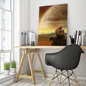 Glasbild - Bild auf glas - Affen sitzen auf einem Felsen mit einem riesigen Mond im Hintergrund - 70x50cm - Die Liebe ist überall gleich - Moderne Wanddekoration für Wohnzimmer und Schlafzimmer ARTTOR