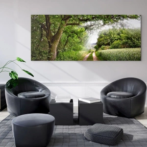 Glasbild - Bild auf glas - Ein Waldweg, umgeben von Grün in den Strahlen der Sonne - 70x50cm - Et in Arcadia ego - Moderne Wanddekoration für Wohnzimmer und Schlafzimmer ARTTOR