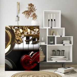 Glasbild - Bild auf glas - Saxophon, Keyboard und Bogen in kunstvoller Komposition - 70x50cm - Blech, Holz und Elfenbein - Moderne Wanddekoration für Wohnzimmer und Schlafzimmer ARTTOR